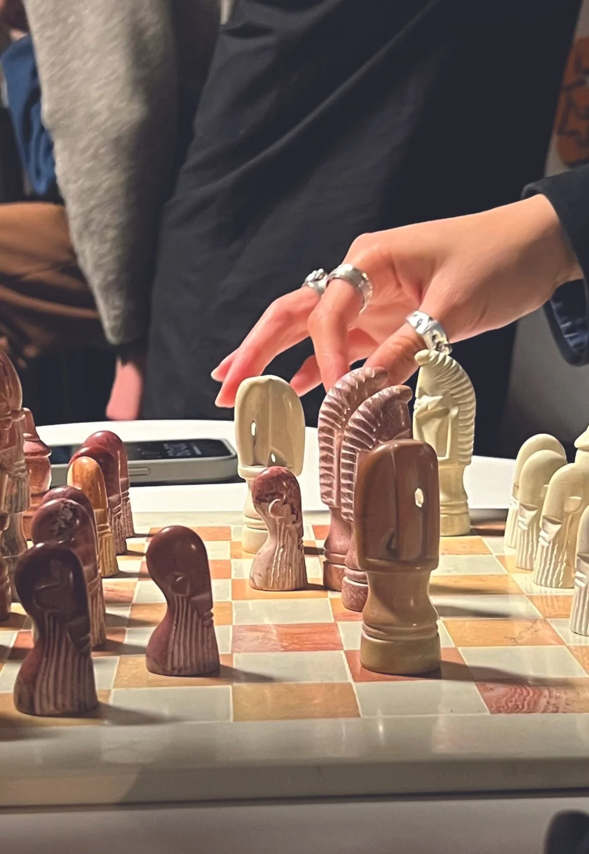 Checking into one of his events on a Tuesday evening, you can expect to see game-related paraphernalia such as a Loyle Carner x ADWYS mini tinned chess set out on a central table, with eager players moving the pieces delicately and with precision. Another common feature is Yus’ breathtaking Tanzanian soapstone set, for whilst chess was previously, and quite stereotypically, seen as a white man’s game, Knight Club offers a new environment in refute of this idea, bringing together a diverse community that reshapes the image of the modern player. In light of this, simple and not so simple boards adorn the rooms. Fashion plays a big part in completing the scene. With bodies blending baggy silhouettes with sharp, tactical layering, and mirroring the strategic nature of the game itself, these players ain’t playin’. United in a new aesthetic in an embrace of individuality, the people in the room stand out just as much as the multifaceted boards scattered around the rooms. As a chess player myself I feel safe in spaces like these knowing that chess belongs to no single person’s identity, and that with every move, every shared strategy, every knowing smile exchanged, the game becomes reclaimed. As RZA from Wu Tang Clan once said, “get in where you fit in”. In light of this I go to Knight Club knowing it has a place for everyone.