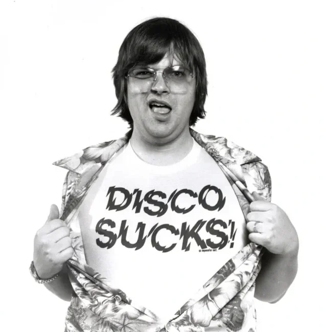 The previous year, Dahl had been laid off by Chicago radio station WDAI when they switched to a strictly disco format, a genre the 24 year old rock’n’roll aficionado refused to play on principle. With his new home at WLUP radio, and an axe to grind, Dahl started what would become a recurring segment and eventual tirade against disco. In between playing predominantly American classic rock, Dahl would play the intro to disco records before scratching the needle over the wax and playing explosion sound effects, simulating the act of blowing up the records. Dahl would often preach his contempt for disco, citing the perceived exclusivity of the subculture, the lack of substance in the music, the effemination of the dress code, and worst of all, his feelings of being “forced to dance”. What started as a gag, soon became a movement. Dahl, with his anti-disco rhetoric inadvertently tapped into the consciousness of predominantly white men who had either grown tired of disco, or, more cynically, saw disco as an existential threat to “traditional American values”.